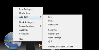 การเพิ่มทางลัดเป็นเรื่องง่าย เลือก "เพิ่ม" จากเมนูบริบทและเรียกดูไฟล์หรือมากกว่าเพียงแค่ลากและวางไฟล์ลงในแถบโดยตรง ถ้าคุณต้องการให้คุณสามารถเปลี่ยน ไอคอน ใด ๆ ของ RocketDock ให้จัดเรียงใหม่โดยลากหรือปรับความเร็วในการแสดงผลตามความชอบของคุณ